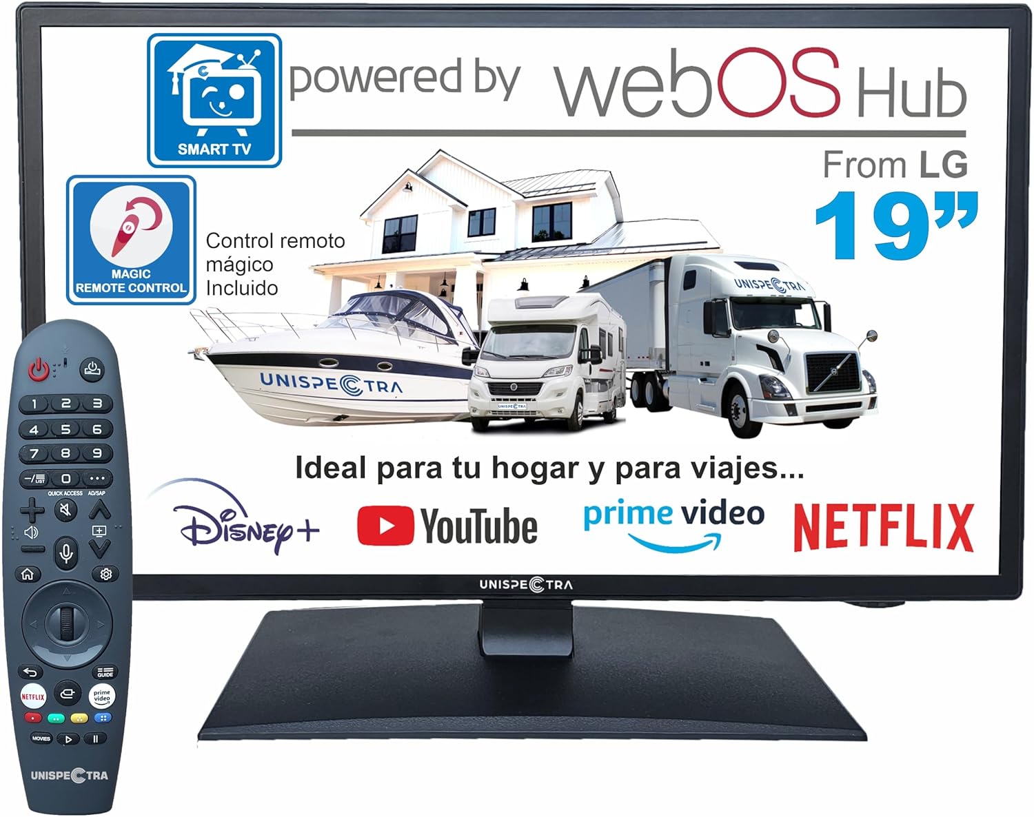 Unispectra Smart TV de 19 pulgadas 12v webOS ELED HDR 240v 24v 12v TV Freeview SAT sintonizador, 3x HDMI, 2x USB, Magic Remote. Televisores de 12 V para autocaravanas, autocaravanas, caravanas,